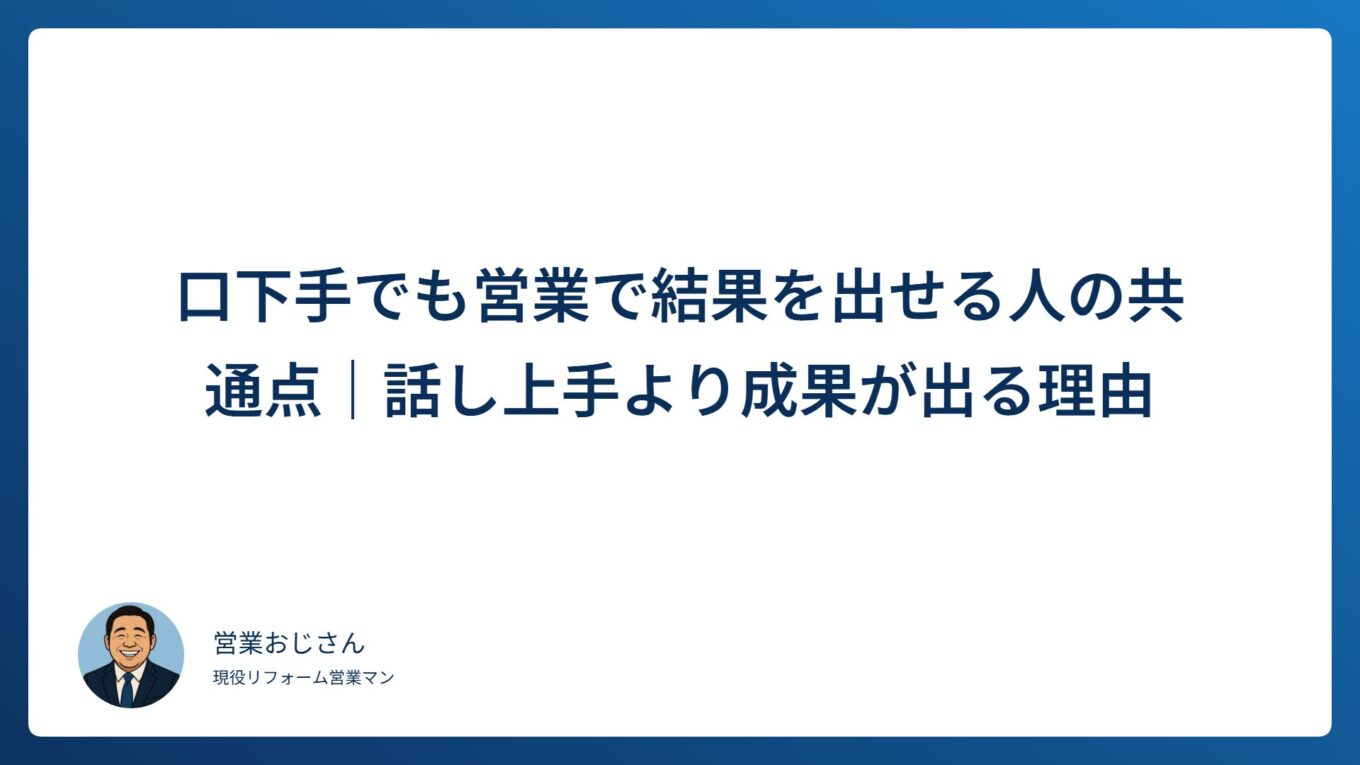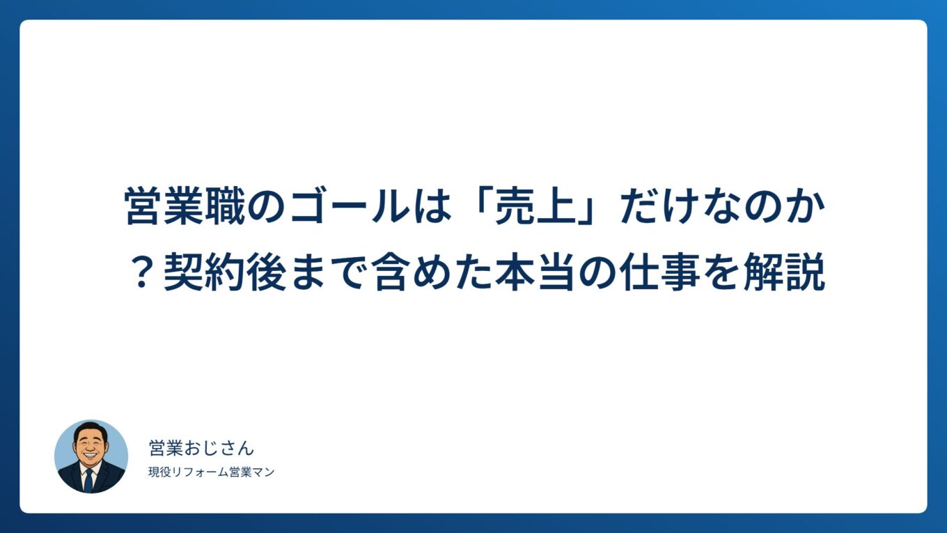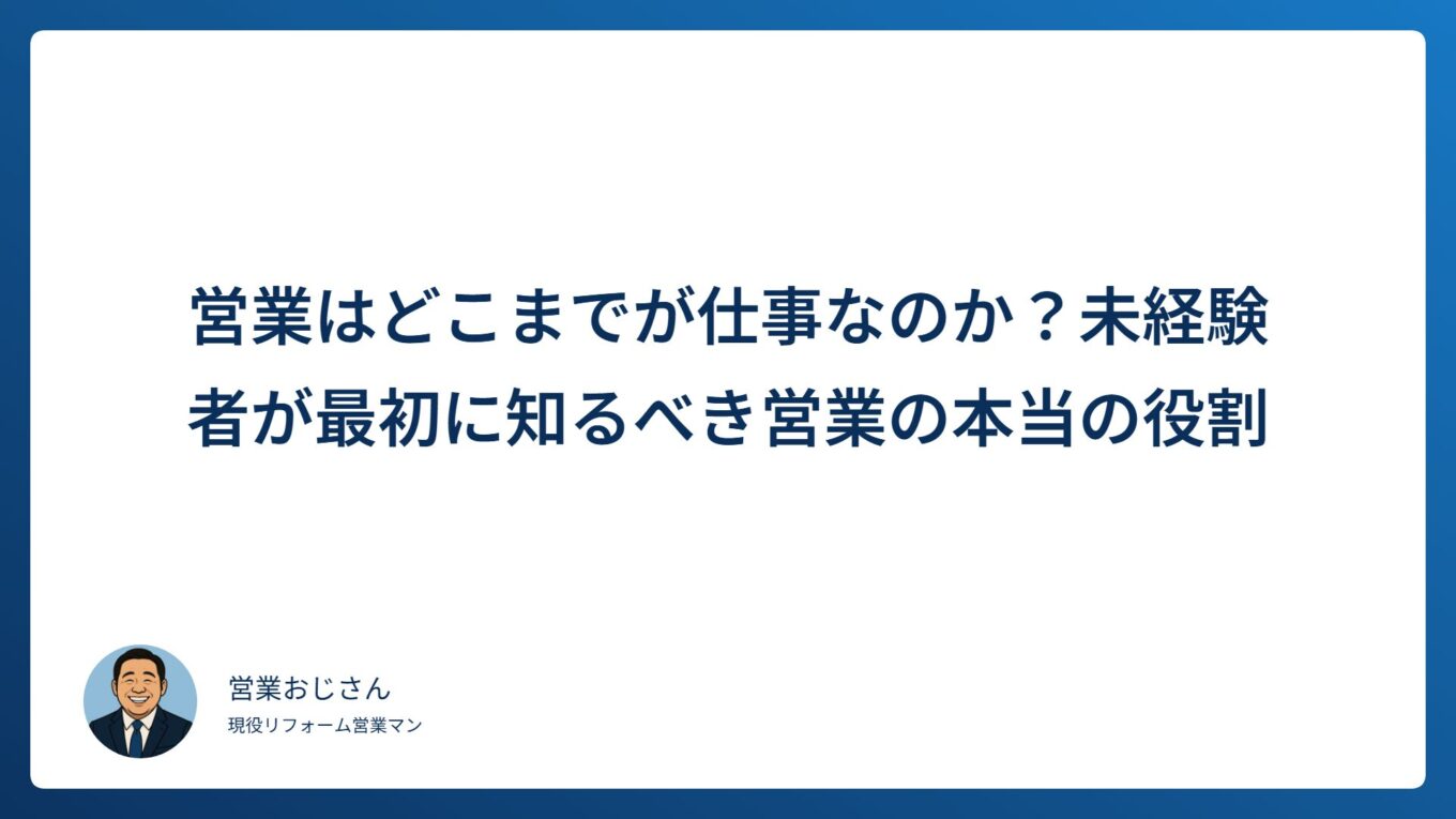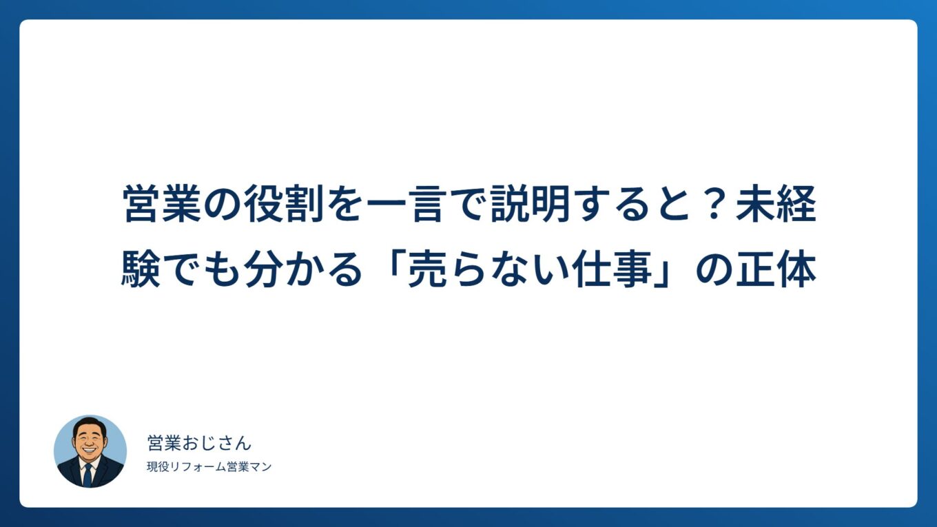 記事内に商品プロモーションを含む場合があります 新着記事News 営業ノルマが怖くて一歩踏み出せない人へ|未経験者が知らない営業の現実 2026.02.02 営業転職で迷う人 営業職は「売る人」というだけではない|会社と市場をつなぐ本当の役割を解説します 2026.01.31 営業の仕事を知る 営業職のゴールは「売上」だけなのか?契約後まで含めた本当の仕事を解説 2026.01.30 営業の仕事を知る 営業おじさんの話 営業の仕事を知る 営業転職で迷う人 人気記事Popular Post 営業転職で失敗する人の共通点|個人差が出やすい仕事ほど「環境」で決まる理由 11 views 営業でつまずく人がハマる落とし穴|努力しても成果が出ない本当の理由 9 views 営業は仕方なく選んでもいい|未経験・学歴不問から始める現実的な選択 8 views 未経験者が営業転職で本気で悩むほどハマる「考えても無駄なこと」 8 views 営業に向いているか悩む人ほど見落としている、営業の見方 7 views 営業職は「売る人」というだけではない|会社と市場をつなぐ本当の役割を解説します 6 views 営業の役割を一言で説明すると?未経験でも分かる「売らない仕事」の正体 6 views 営業が合わないか不安な未経験者へ|向き不向きではなく「営業スタイル」で決まります 6 views 営業おじさん現役リフォーム営業マンProfile“営業おじさん”です。 37歳で未経験から営業の世界に飛び込み、現在はリフォーム営業マンとして現場に立っています。 営業という仕事のリアルや、転職で迷ったときの考え方を、実体験をもとに発信しています。プロフィールを読む