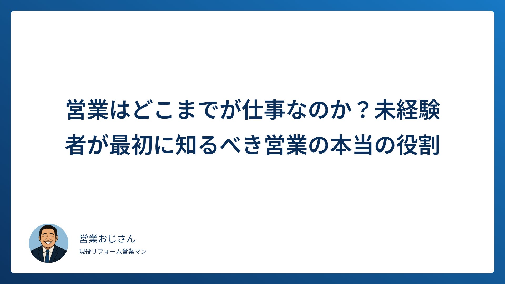 CATEGORY 営業の仕事を知る 営業職は「売る人」というだけではない|会社と市場をつなぐ本当の役割を解説します 2026.01.31 営業の仕事を知る sawamurakazuya41@gmail.com 営業おじさん 営業職のゴールは「売上」だけなのか?契約後まで含めた本当の仕事を解説 2026.01.30 営業の仕事を知る sawamurakazuya41@gmail.com 営業おじさん 営業はどこまでが仕事なのか?未経験者が最初に知るべき営業の本当の役割 2026.01.29 営業の仕事を知る sawamurakazuya41@gmail.com 営業おじさん 営業の役割を一言で説明すると?未経験でも分かる「売らない仕事」の正体 2026.01.28 営業の仕事を知る sawamurakazuya41@gmail.com 営業おじさん 営業職とは何をする仕事なのか?仕事内容・きつい理由・向き不向きを現実ベースで整理 2026.01.01 営業の仕事を知る sawamurakazuya41@gmail.com 営業おじさん