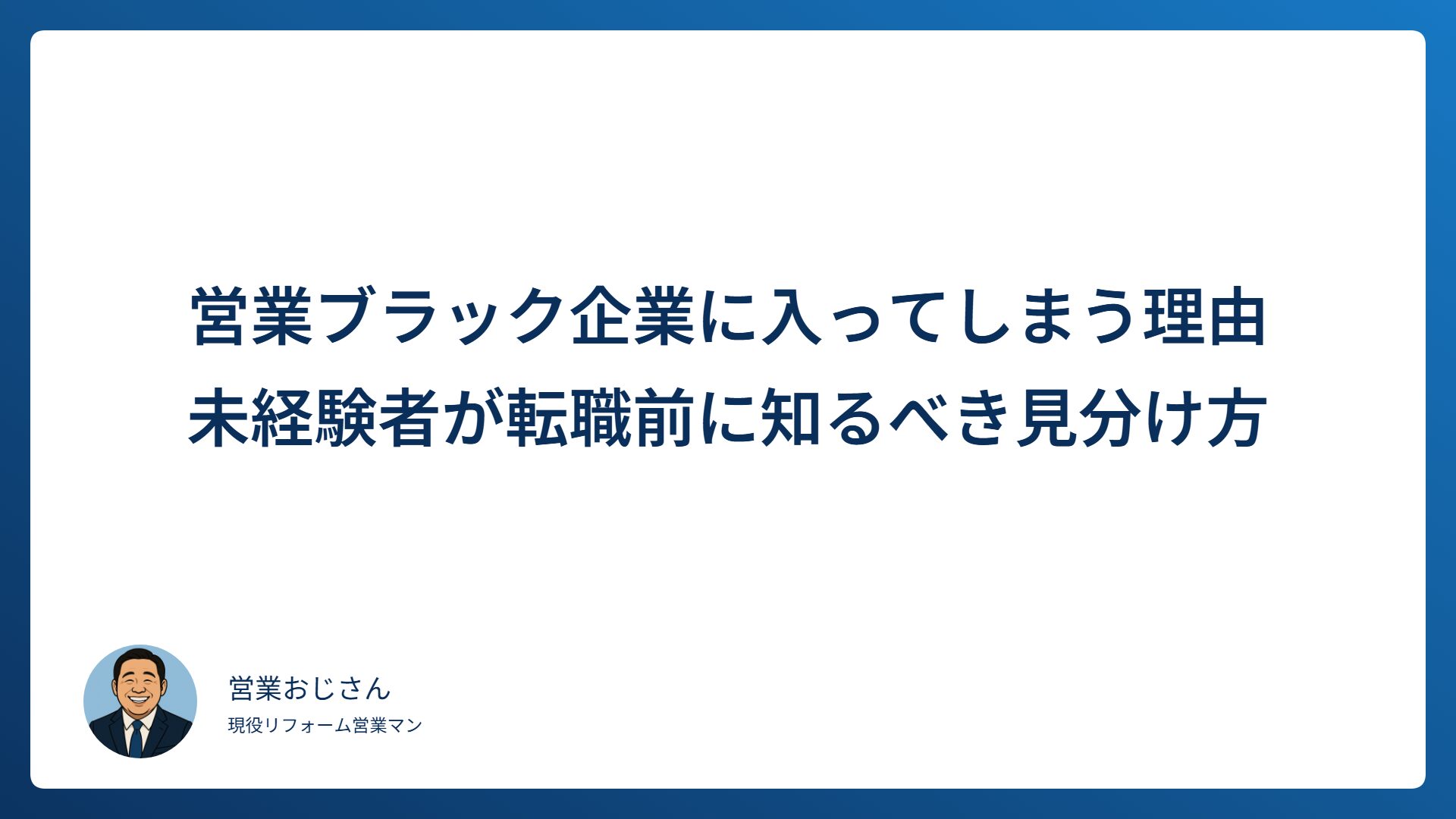 TAG 転職失敗 営業ブラック企業に入ってしまう理由|未経験者が転職前に知るべき見分け方 2026.03.02 営業転職で迷う人 sawamurakazuya41@gmail.com 営業おじさん 営業転職で年収が下がる人の特徴|年収を基準にするなら先に決めるべきこと 2026.02.28 営業転職で迷う人 sawamurakazuya41@gmail.com 営業おじさん 営業転職でブラックを引く人の共通点|労働時間では見抜けない判断基準 2026.01.09 営業おじさんの話 sawamurakazuya41@gmail.com 営業おじさん 営業転職で失敗する人の共通点|個人差が出やすい仕事ほど「環境」で決まる理由 2026.01.04 営業おじさんの話 sawamurakazuya41@gmail.com 営業おじさん