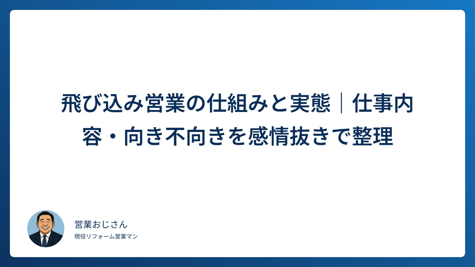 TAG 飛び込み営業 飛び込み営業は今もある?実態・割合・きついと言われる理由を未経験者向けに解説 2026.02.16 営業転職で迷う人 sawamurakazuya41@gmail.com 営業おじさん 飛び込み営業の仕組みと実態|仕事内容・向き不向きを感情抜きで整理 2026.02.10 営業の仕事を知る sawamurakazuya41@gmail.com 営業おじさん